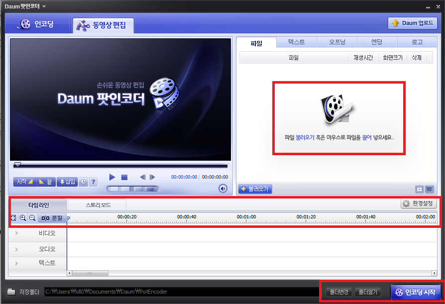 다음팟인코더 설치 완료 후 해당 프로그램을 실행시키면 위 이미지와 같이 편집 창이 보이실 텐데요.
