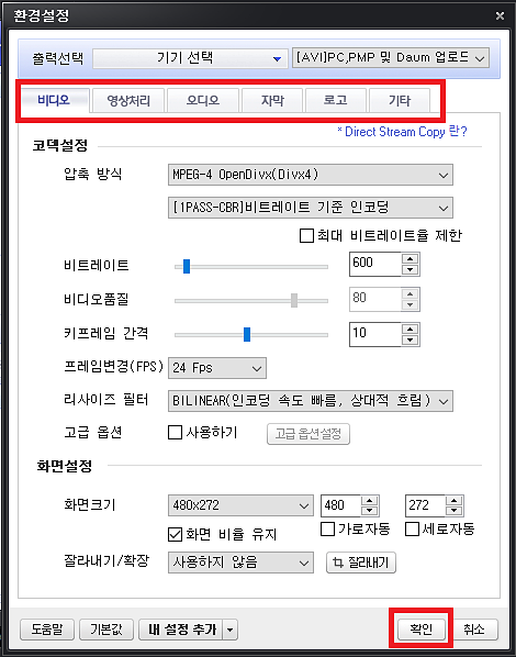 비디오, 영상처리, 오디오, 자막, 로고 등 여러 설정값을 본인의 입맛에 맞게 변경 후 확인버튼을 누르면 변경된 내용이 적용됩니다.