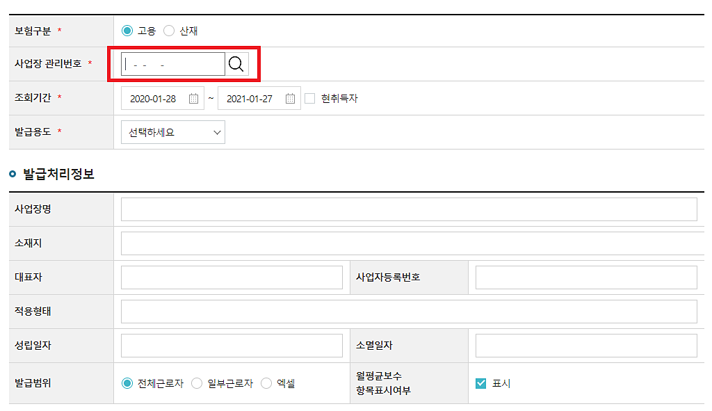 해당 메뉴로 진입하면 증명서 발급에 필요한 정보를 입력하는 창이 나옵니다.