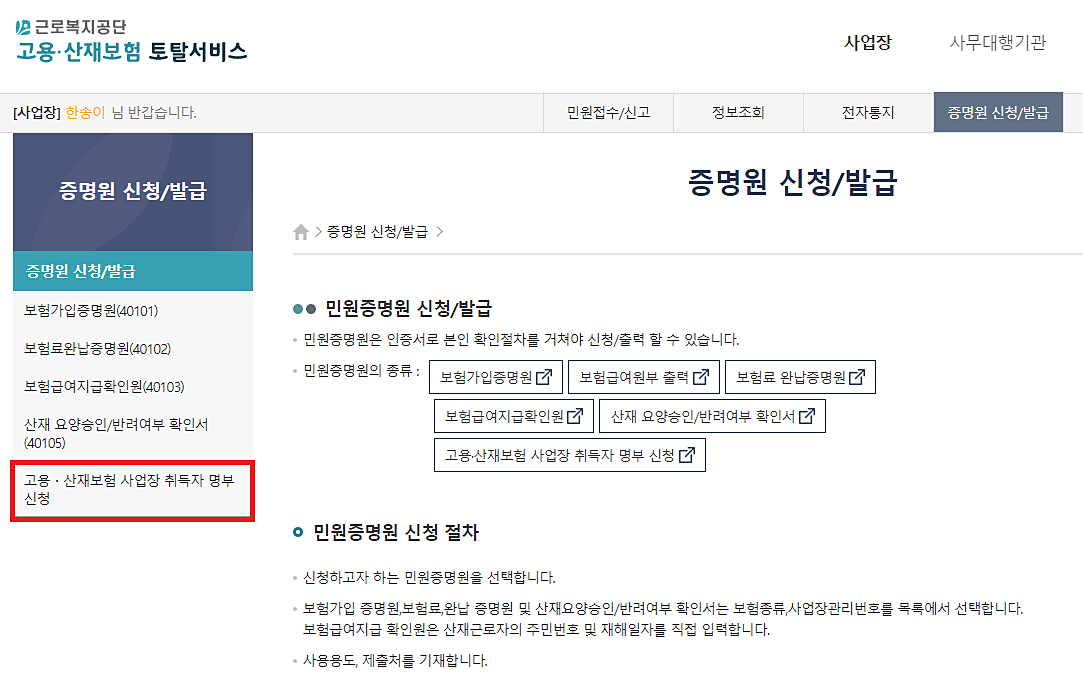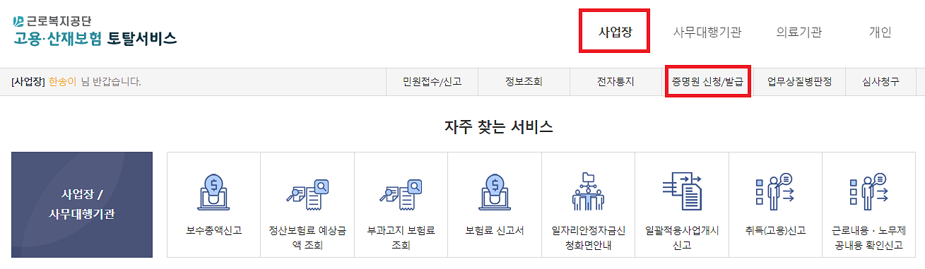 로그인을 하고 난 후 왼쪽 상단에 보시면 "사업장 - 증명원 신청/발급" 버튼이 보입니다.