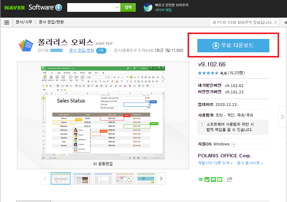 두번째로 무료로 사용 가능한 엑셀 다운로드 방법은 바로 폴라리스 오피스 입니다.