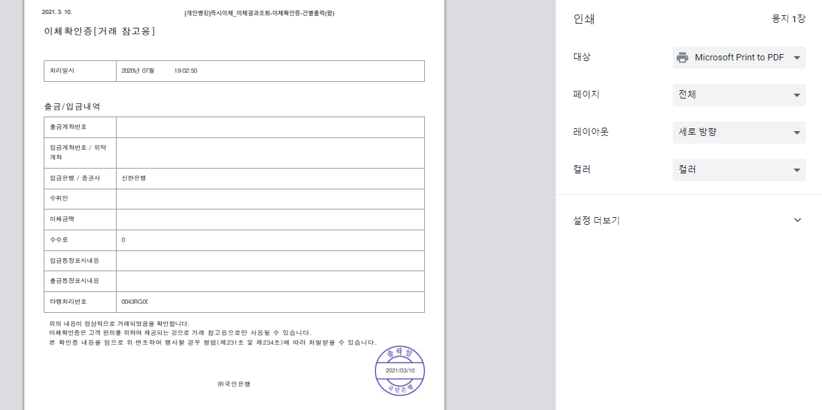 그러면 위 이미지와 같이 이체확인증 미리보기 창이 뜹니다. 여기에 출금계좌 정보와 이체일자, 금액 등 이체와 관련된 주요 정보들이 표시되고 국민은행에서 인증했다는 뜻으로 도장이 찍혀 있습니다.