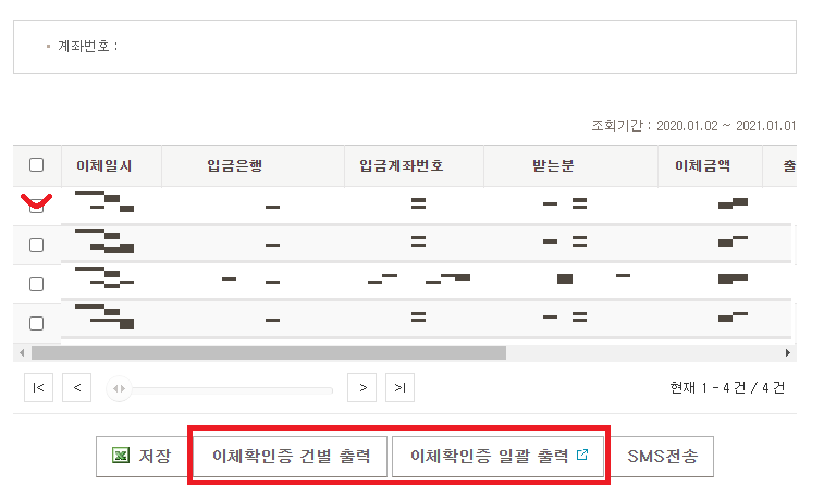 여기서 이체확인증이 필요한 내역을 왼쪽에 체크박스에서 선택한 후 하단을 보시면 "이체확인증 건별 출력" 이나 "이체확인증 일괄 출력" 버튼이 보이실 겁니다.