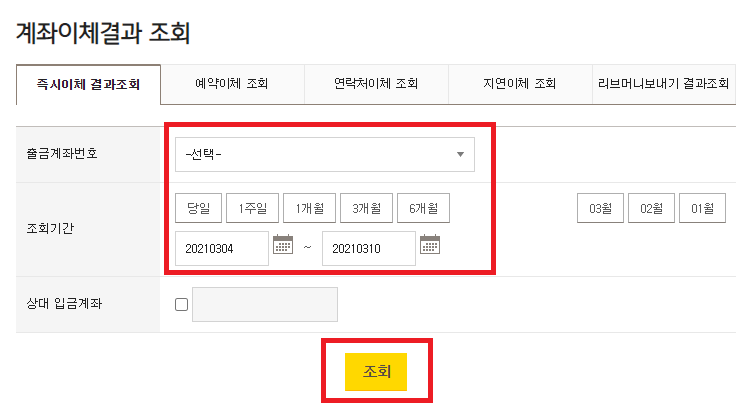 하단에 출금계좌를 선택할때 이체확인증을 발급하려는 계좌를 선택해 줍니다. 조회기간을 설정하고 조회 버튼을 누르면 해당 기간동안 이체한 내역에 대해 확인이 가능합니다.