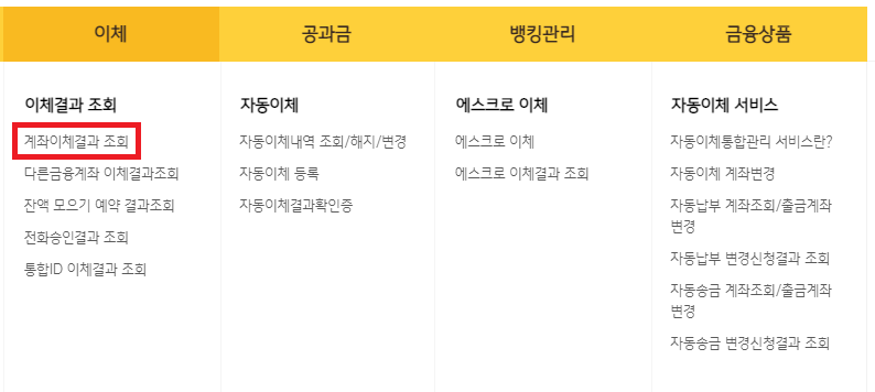 로그인 후 상단메뉴바에 이체-계좌이체결과 조회로 선택하여 해당 페이지로 들어갑니다.